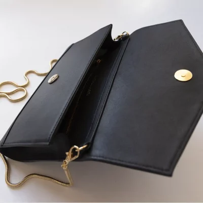 Black clutch in natural embossed cowhide leather with a “snake” chain and 24-karat gold-plated micro-clasps with a polished finish. Clasp also available in other finishes.