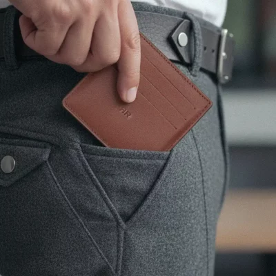 Calfskin card holder, minimalist design, practical and functional with three card slots on each side and an open top pocket lined in the same leather.