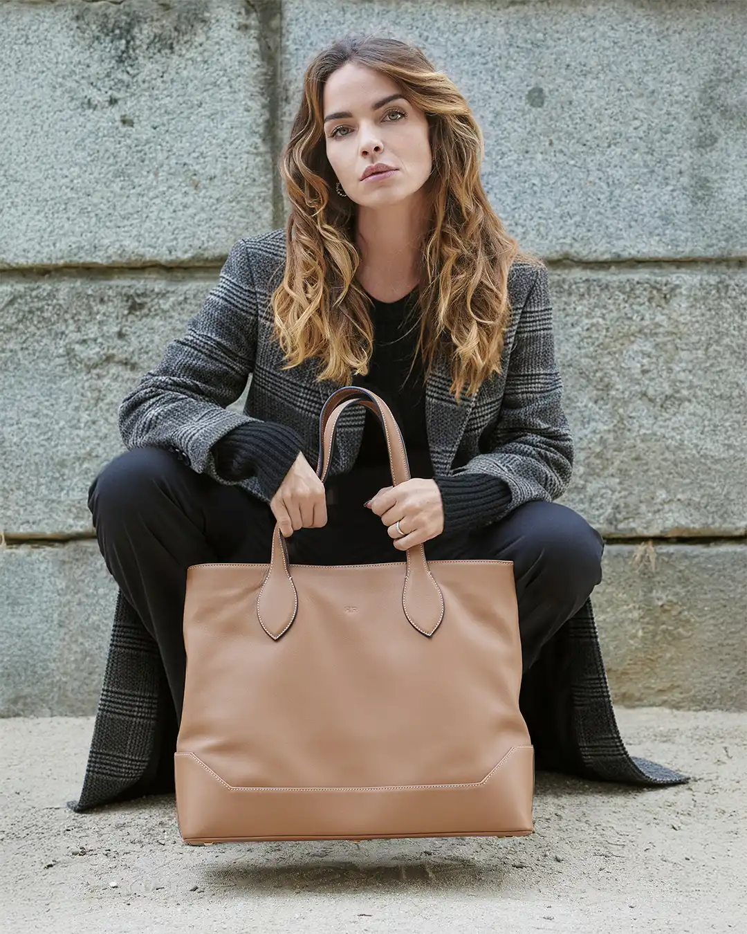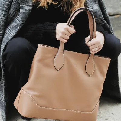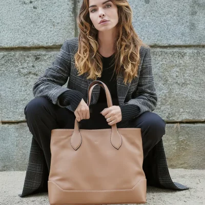 Un bolso tote de piel en tono macadamia, con un aire urbano, pero elegante, nace para acompañar días largos y agendas llenas sin renunciar a la elegancia.