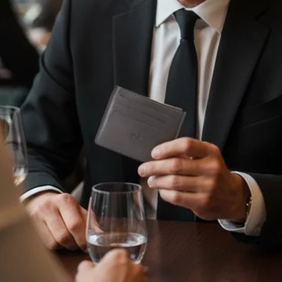 Tarjetero en piel de ternera, con tres ranuras a cada lado para tarjetas y un bolsillo superior abierto forrado en la misma piel.